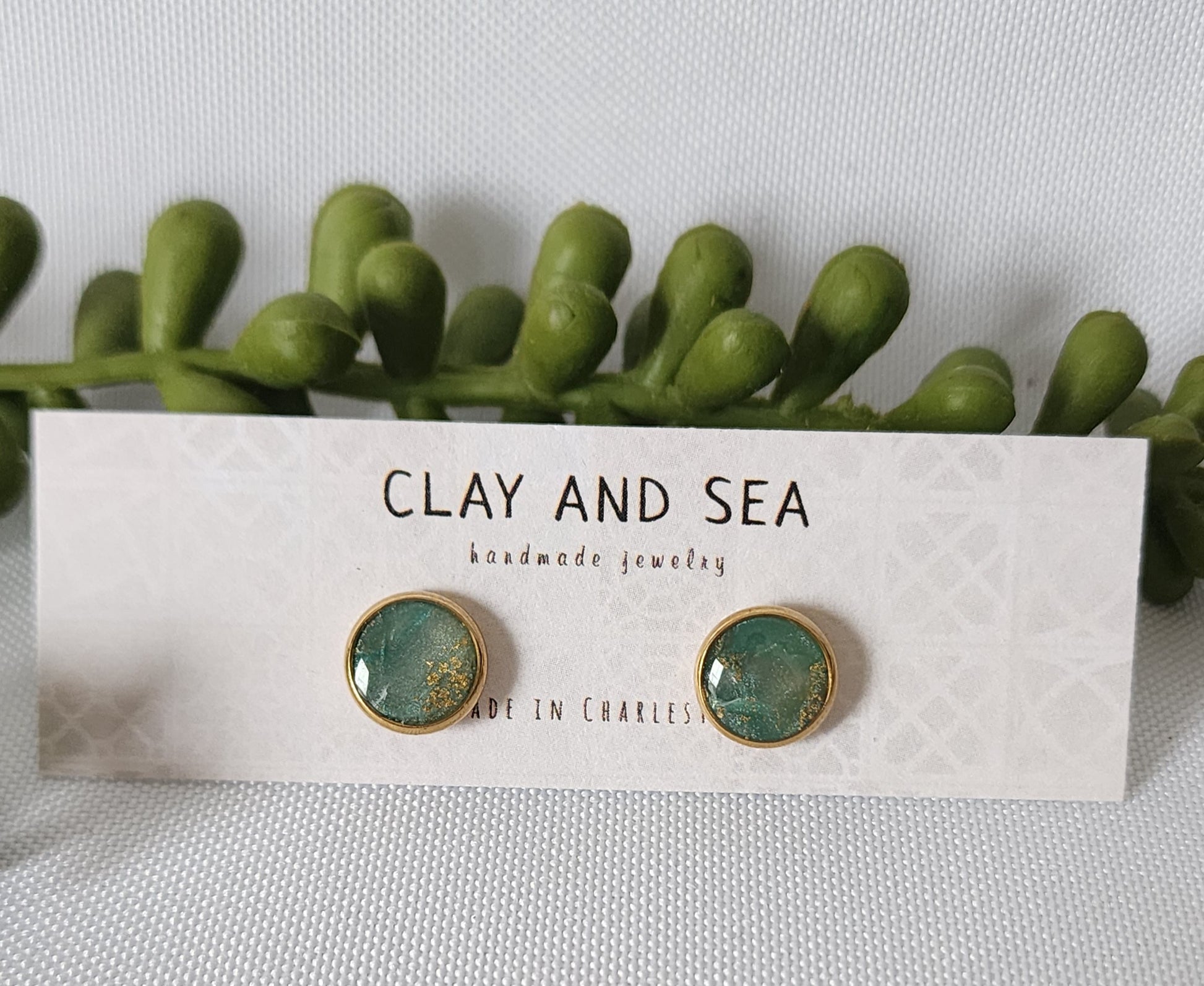 Handmade polymer clay earrings in a beautiful seafoam with shimmery marbling throughout. Each pair is one of a kind and set on 18k gold-plated stainless steel stud posts for a touch of elegance and everyday comfort.